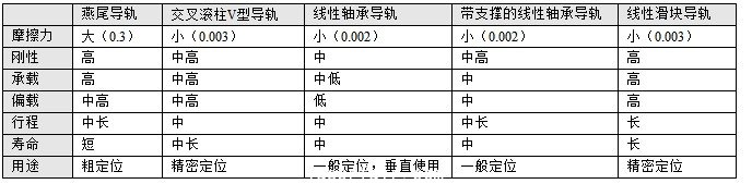 電機(jī)控制的電動平移臺(電控位移臺)因?yàn)榭梢赃M(jìn)行電路細(xì)分,分辨率可以達(dá)到超微米級,還可通過計(jì)算機(jī)控制,達(dá)到自動化目的。電動平移臺多采用滾珠絲杠傳動,可循環(huán)的線性軸承或線性滑塊做導(dǎo)軌,所以行程可以很大,可到1米,負(fù)載可到50kg(慢速還可提高),精度也可達(dá)到微米級,但價(jià)格偏貴。下表對常用導(dǎo)軌作了比較: