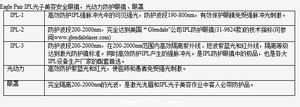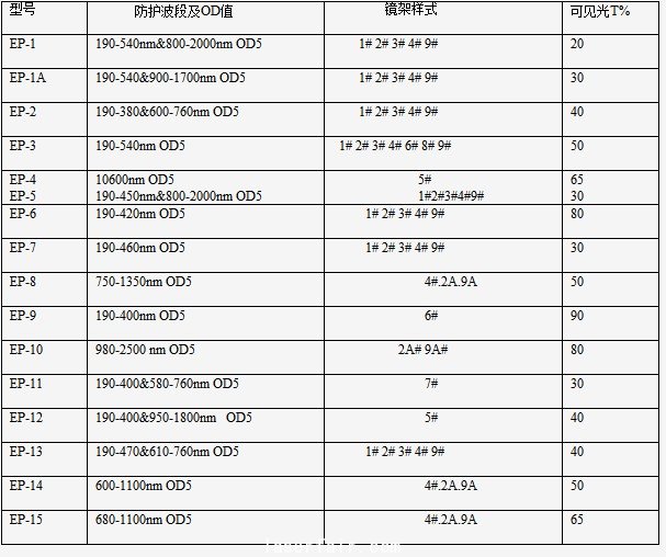 Eagle Pair寬光譜連續(xù)吸收式激光防護鏡技術參數及鏡架樣式表