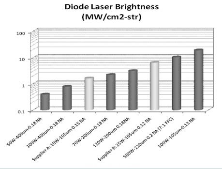 圖2.二極管激光器亮度(MW/cm2-str)為各種各樣的二極管激光器模塊。亮度超過18MW / cm2-str已經(jīng)達到了使用nLIGHT的PearlTM生產(chǎn)線的水平。