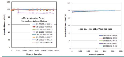 為測量這些包裝的可靠性進行了,九個模塊在10x加速度條件下被測量(加速高溫和功率運作)。 而激光激光器包裝測量的FIT率(1200FIT)和二極管激光器在終身測試套上所測試的FIT率(1150)相匹配,顯示出了缺乏包裝故障率 (PIF)。這些設備的性能lifetest如下圖,如圖4。模塊失敗在輸出功率方面被描述為20%的退化(或相應增加20% 偏置電流),在給定的加速因素下而激光激光器相當于超過75000小時的操作下沒有模塊故障。類似包裝運行在硬脈沖條件下,以 20ms上升下降。
