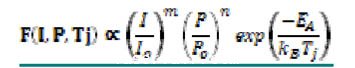 為評估一個新的3.8mm腔長二極管的可靠性,一直在進行中的多元壽命測試試驗長達3000小時來決定溫度、電流,功率加速因素,以及可靠運行條件。 一個隨機故障加速模型可以用以下模型來表述,其中突然失效F由二極管電流I加速引起,光輸出功率P和接點溫度Tj: