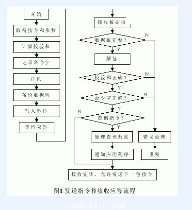 (5)應(yīng)答方式。在通信過程,下位機(jī)對上位機(jī)每一幀數(shù)據(jù)都必須做出的應(yīng)答。上位機(jī)根據(jù)返回的應(yīng)答判斷通信狀態(tài),然后進(jìn)行下一步動作。為了安全起見,規(guī)定只有在確認(rèn)前一包指令正確應(yīng)答之后,才可以發(fā)下一包指令。對于非查詢指令(包括全部解釋執(zhí)行指令和部分立即執(zhí)行指令),下位機(jī)收到后,返回該指令的命令字;對于查詢指令,除了返回命令字之外,同時還返回查詢數(shù)據(jù),如機(jī)器人的位置、各軸轉(zhuǎn)角等。如果下位機(jī)檢測到數(shù)據(jù)幀有問題,如無幀頭、校驗(yàn)和錯等,則返回相應(yīng)的錯誤碼。上位機(jī)在發(fā)送指令的時候,同時記錄下了該指令的命令字。在接收到下位機(jī)返回的應(yīng)答后,將其中的命令字與保留的命令字比較,如果一樣,則說明發(fā)送正確,可以發(fā)送下一條指令;反之,則說明指令發(fā)送有問題,根據(jù)錯誤碼進(jìn)行錯誤處理,并重發(fā)當(dāng)前指令包。指令的發(fā)送和應(yīng)答的接收過程如圖1所示。