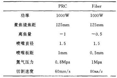 表3為光纖激光器與PRC 激光器對(duì)于1.5mm厚不銹鋼板(1Crl8Ni9Ti)切割參數(shù)的比較。