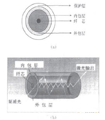 圖1是雙包層光纖截面結(jié)構(gòu)及其工作原理圖。從圖1(a)雙包層光纖的截面結(jié)構(gòu)町見,光纖包括四個(gè)部分:纖芯、內(nèi)包層、外包層、保護(hù)層。用分別表示雙包層光纖的纖芯、內(nèi)包層、外包層和保護(hù)層的折射率,則折射率應(yīng)滿足:。