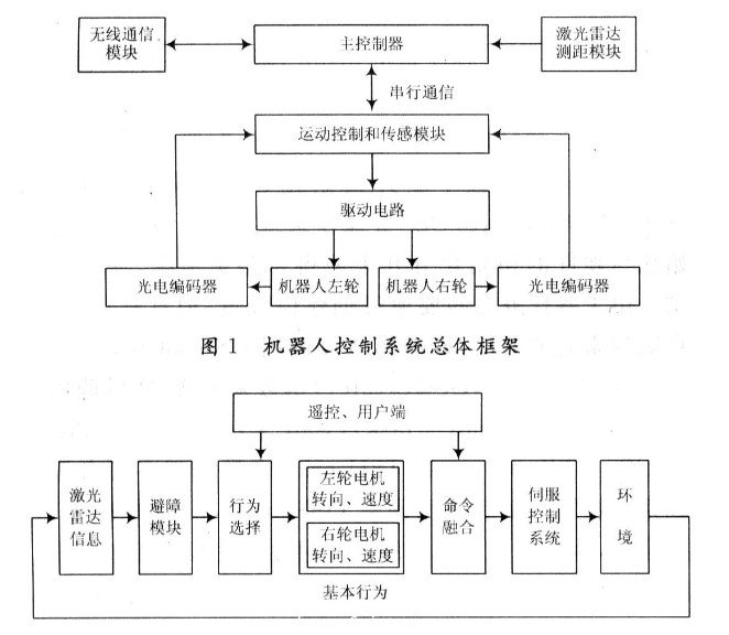 按功能劃分,該控制系統(tǒng)分為上下兩層。由實(shí)現(xiàn)任務(wù)管理、運(yùn)動(dòng)軌跡生成、定位的上層控制系統(tǒng),以及完成機(jī)器人伺服控制、傳感器信息采集的下層控制系統(tǒng)組成。上層控制系統(tǒng)是整個(gè)控制系統(tǒng)的核心控制層,它有兩種控制實(shí)現(xiàn)方式:一種是獨(dú)立運(yùn)行模式,另一種是遙控或遠(yuǎn)程實(shí)時(shí)控制模式。獨(dú)立運(yùn)行模式有自己的運(yùn)行參數(shù),即上層控制系統(tǒng)根據(jù)激光雷達(dá)的信息傳遞到環(huán)境建模模塊,產(chǎn)生環(huán)境地圖并產(chǎn)生避障算法所需信息,控制器根據(jù)避障模塊信息產(chǎn)生機(jī)器人本體速度和方向信息,傳遞到運(yùn)動(dòng)控制器。在運(yùn)動(dòng)控制底層程序定義了一系列程序,運(yùn)動(dòng)控制器通過解釋上層控制系統(tǒng)傳遞過來的信息并執(zhí)行相應(yīng)程序,從而達(dá)到機(jī)器人控制的目的,實(shí)現(xiàn)實(shí)時(shí)避障。遙控器或遠(yuǎn)程實(shí)時(shí)控制模式是通過無線通信單元接收用戶端或遙控端發(fā)出的命令,實(shí)現(xiàn)對(duì)機(jī)器人的實(shí)時(shí)控制。系統(tǒng)的控制實(shí)現(xiàn)方式如圖2所示。