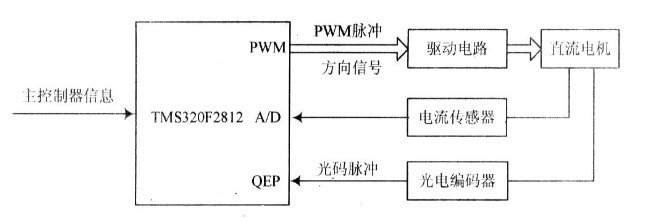 運(yùn)動(dòng)控制模塊通過RS 232與主控制模塊連接,主控制模塊通過串行總線將期望速度、方向信息傳送至運(yùn)動(dòng)控制器,運(yùn)動(dòng)控制器將信息處理后作為運(yùn)動(dòng)控制算法的輸入量,運(yùn)動(dòng)控制算法得到以PWM形式表示的電機(jī)控制信息。為判斷電機(jī)轉(zhuǎn)速及運(yùn)轉(zhuǎn)方向,安裝在電機(jī)上的光電編碼器提供相位相差90°的兩個(gè)通道的光碼脈沖輸出,光電編碼器產(chǎn)生的兩脈沖送入DSP的正交編碼脈沖單元的QEP1,QEP2引腳,通過DSP的比較單元CAP1,CAP2捕捉,然后經(jīng)譯碼單元產(chǎn)生內(nèi)部4倍頻后的脈沖信號(hào)CLK以及轉(zhuǎn)向信號(hào),將脈沖信號(hào)送入選定的計(jì)數(shù)器進(jìn)行計(jì)數(shù),計(jì)數(shù)方向由轉(zhuǎn)向信號(hào)決定,通過讀取選定通用定時(shí)器的計(jì)數(shù)值、脈沖數(shù)、計(jì)數(shù)方向可得到電機(jī)的轉(zhuǎn)速、行程及方向?yàn)樗欧刂铺峁┓答佪斎?。沒計(jì)使用TI公司的TMS320F2812作為控制驅(qū)動(dòng)模塊的控制器,該芯片產(chǎn)生的PWM信號(hào)并不能夠直接驅(qū)動(dòng)電機(jī)的執(zhí)行,設(shè)計(jì)時(shí)使用TI公司的直流電機(jī)驅(qū)動(dòng)芯片SN7S4410將PWM轉(zhuǎn)換成可驅(qū)動(dòng)電機(jī)的驅(qū)動(dòng)信號(hào)。圖4為移動(dòng)機(jī)器人運(yùn)動(dòng)控制系統(tǒng)的原理圖。