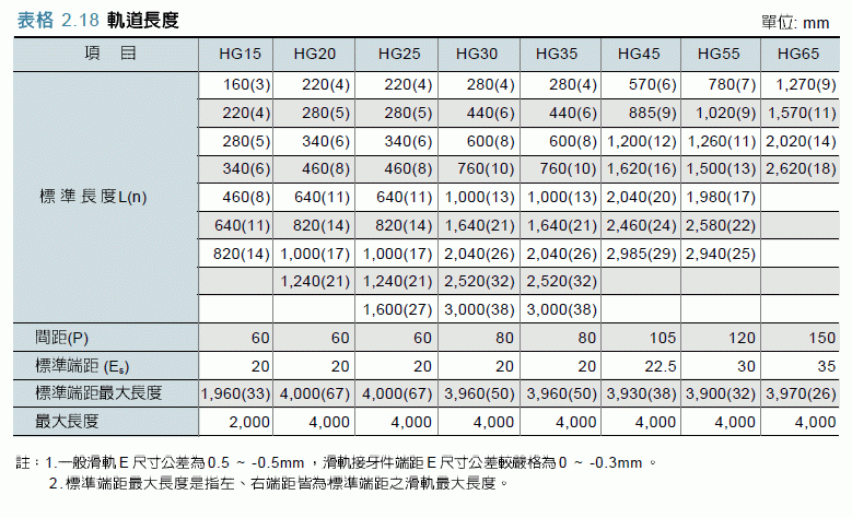 2-1-13 單支滑軌標準長度及最大長度