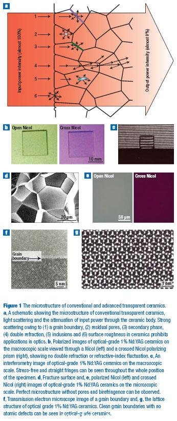 如圖1a所示,陶瓷是由很多取向無(wú)序的微晶所組成。半透明陶瓷的制備始于20世紀(jì)50年代,但是具有高效激光振蕩的透明陶瓷卻是從20世紀(jì)90年代才出現(xiàn)的。理由很簡(jiǎn)單,半透明陶瓷中包含很多散射中心,如晶界相、殘余氣孔和第二相,這些散射中心能夠顯著的引起散射損失,并最終使得在半透明陶瓷增益介質(zhì)不能實(shí)現(xiàn)激光振蕩。1995A. Ikesue博士在美陶中報(bào)道的Nd:YAG陶瓷具有與單晶相近的激光性能。文中報(bào)道的Nd:YAG透明陶瓷的顯微結(jié)構(gòu)與傳統(tǒng)的半透明陶瓷有明顯的區(qū)別。從圖1b和圖1c中可以看出,這些材料中沒(méi)有雙折射和折射率的變化,表明透明陶瓷的光學(xué)質(zhì)量很高。在圖1d和圖1e的微觀照片中可以看出,沒(méi)有殘余氣孔、第二相和光學(xué)不均勻區(qū)域。從圖1f和圖1g可以發(fā)現(xiàn),原子尺度的晶界非常干凈,在晶粒內(nèi)部的點(diǎn)缺陷、線缺陷和位錯(cuò)缺陷已經(jīng)控制在很小的程度。