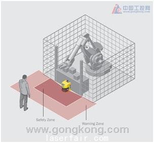 有兩個(gè)自定義的區(qū)域類(lèi)型:安全區(qū)(也稱(chēng)保護(hù)區(qū));警戒區(qū)(也稱(chēng)預(yù)警區(qū))。如果有人進(jìn)入警戒區(qū),激光掃描儀會(huì)輸出聽(tīng)覺(jué)或視覺(jué)的報(bào)警信號(hào)。如果有人在安全區(qū)進(jìn)行違規(guī)操作,則掃描儀會(huì)自動(dòng)開(kāi)啟安全保護(hù)、緊急停機(jī)程序。