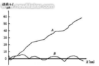 對(duì)一臺(tái)型號(hào)為YCM-VMC-65A的加工中心的的X軸定位誤差進(jìn)行檢測(cè),補(bǔ)償前后誤差曲線如圖3所示。補(bǔ)償前其X軸定位誤差曲線為A,最大誤差為57 6μm,經(jīng)過(guò)補(bǔ)償后,其X軸定位誤差曲線為B,最大誤差僅為6 6μm。