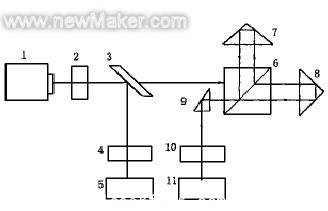 1 激光器;2 λ/4片;3 分光器;4 檢偏器;5 接收器;6 偏振分光器;7,8 反射鏡;9 棱鏡
