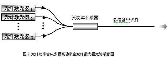 圖2為采用光纖功率合成技術(shù)制作多模光纖激光器的光路示意圖,采用這種技術(shù),可將多個單模連續(xù)光纖激光器的輸出功率合成起來,獲得數(shù)萬瓦或更高的光功率輸出并且光束質(zhì)量良好。