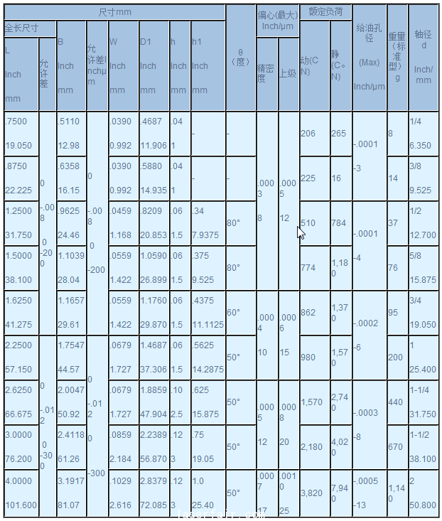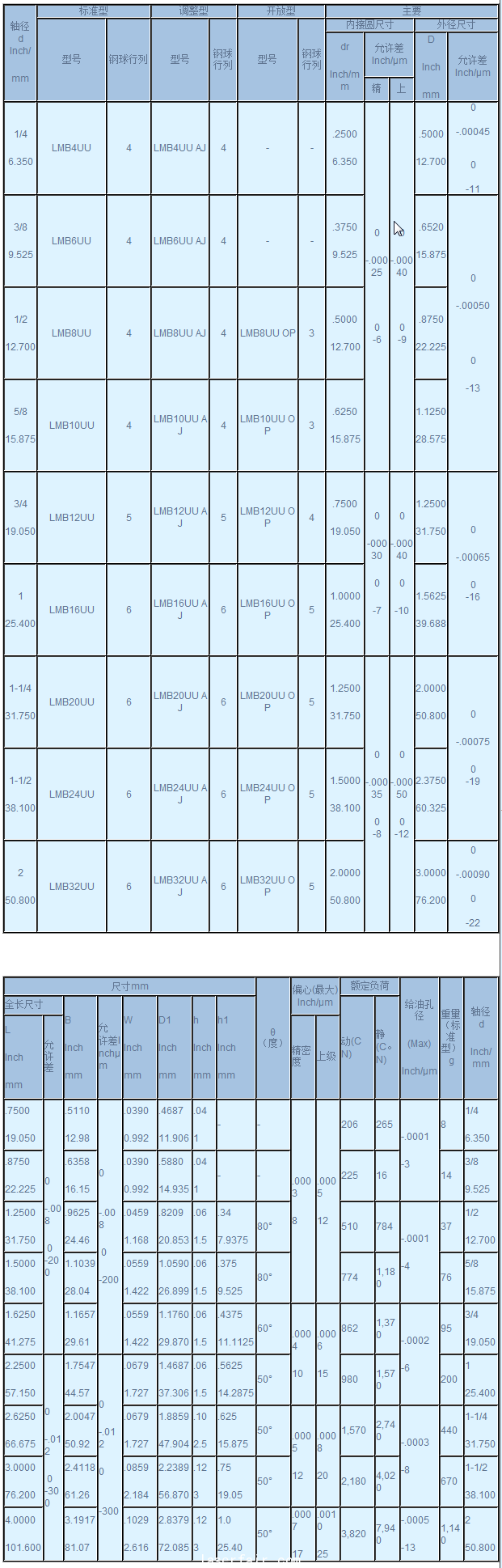LMB英制系列 LMB英制直線軸承系列 軸徑 d Inch/ mm 標(biāo)準(zhǔn)型 調(diào)整型 開放型 主要 型號(hào) 鋼球行列 型號(hào) 鋼球行列 型號(hào) 鋼球行列 內(nèi)接圓尺寸 外徑尺寸 dr Inch/mm 允許差 Inc...
