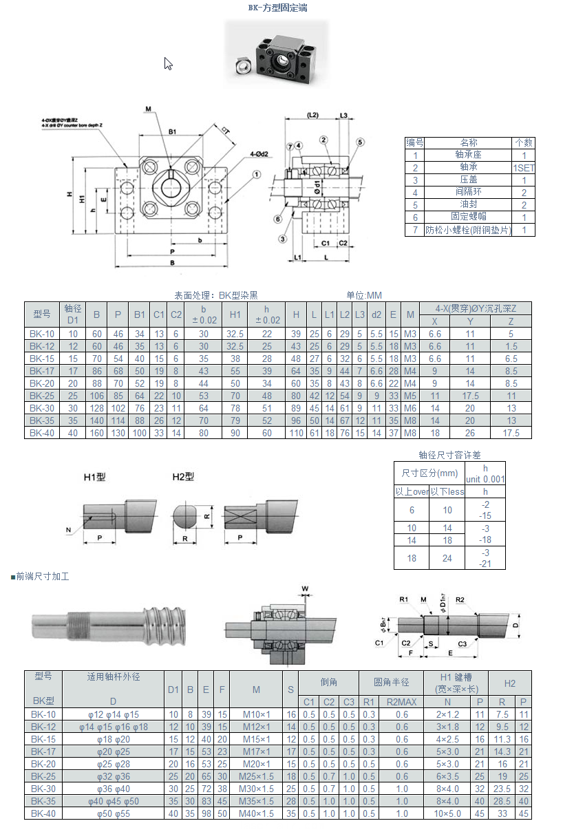BK-方型固定端 編號(hào) 名稱 個(gè)數(shù) 1 軸承座 1 2 軸承 1SET 3 壓蓋 1 4 間隔環(huán) 2 5 油封 2 6 固定螺帽 1 7 防松小螺栓(附銅墊片) 1 表面處理:BK型染黑 單位:MM 型號(hào) 軸徑 D...