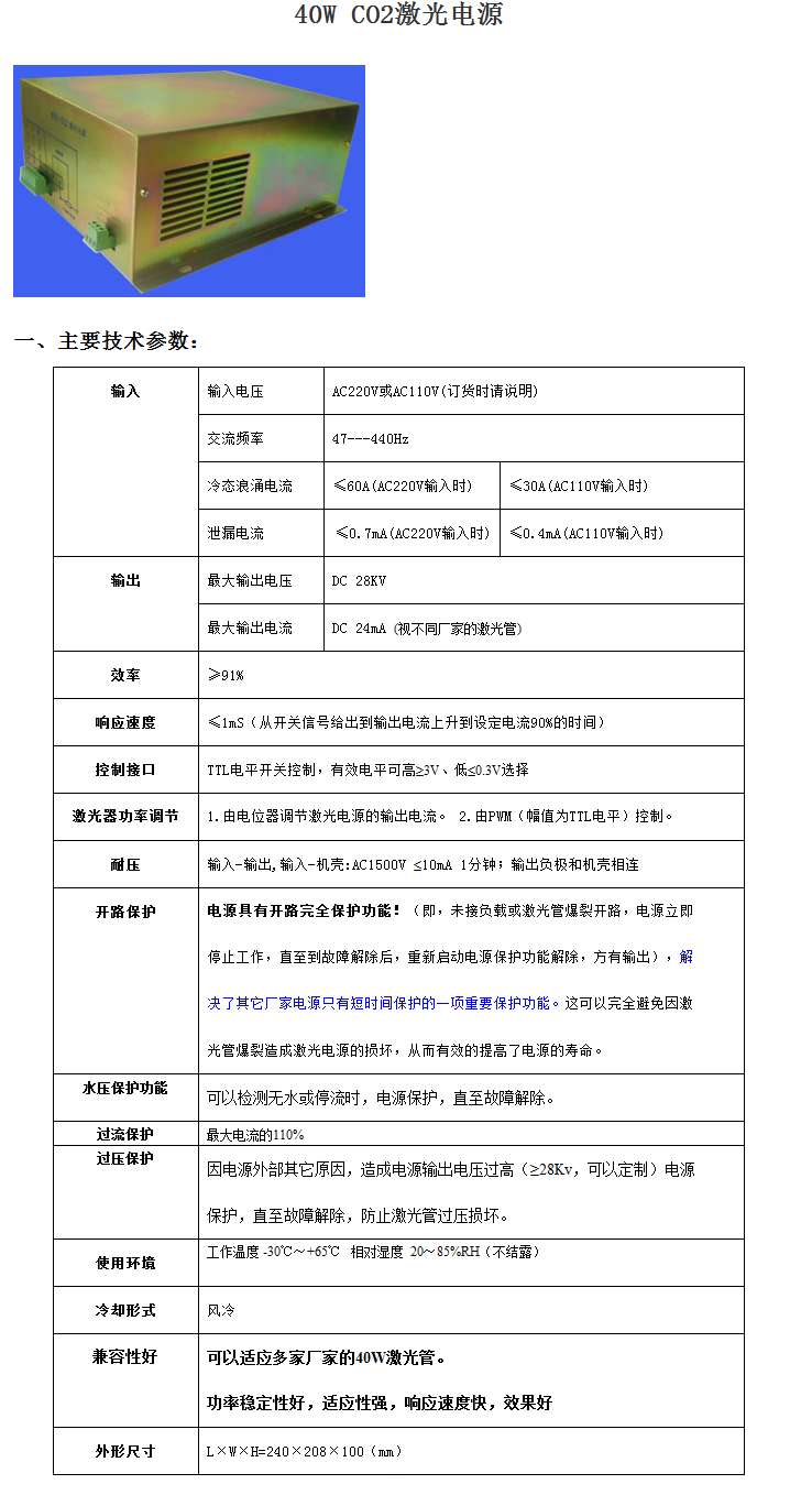 40W CO2激光電源 一、 主要技術(shù)參數(shù): 輸入 輸入電壓 AC220V或AC110V(訂貨時(shí) 請(qǐng) 說明) 交流頻率 47---440Hz 冷態(tài)浪涌電流 60A(AC220V輸入時(shí)) 30A(AC110V輸入時(shí)) 泄漏電...