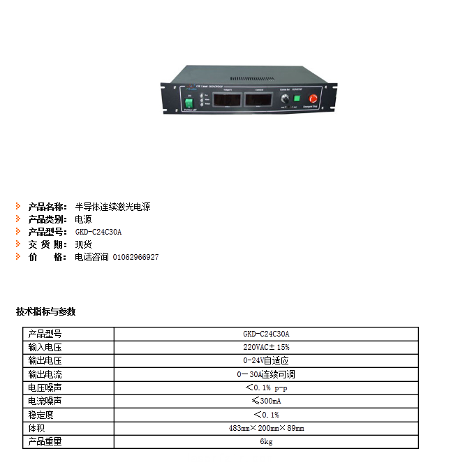 產(chǎn)品名稱: 半導(dǎo)體連續(xù)激光電源 產(chǎn)品類別: 電源 產(chǎn)品型號(hào): GKD-C24C30A 交 貨 期: 現(xiàn)貨 價(jià) 格: 電話咨詢 01062966927 技術(shù)指標(biāo)與參數(shù) 產(chǎn)品型號(hào) GKD-C24C30A 輸入電...