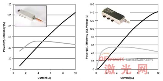 對(duì)于使用高亮度激光器系統(tǒng)來(lái)說(shuō),nLight 公司正在研發(fā)100µm發(fā)射源孔隙, 9xx nm的單一發(fā)射源二極管激光器,10W 976nm。這些設(shè)備有一個(gè)最高效率超過(guò)65%,有98%的極化純度偏振耦合效率,操作在10W功率以60%的效率。nLight公司的每個(gè)設(shè)備是很難焊接到相匹配的submounts和個(gè)別地被高功率篩選,加速老化高功率測(cè)試,嚴(yán)格的視覺(jué)檢測(cè)。典型的LIV曲線顯示在圖1中。