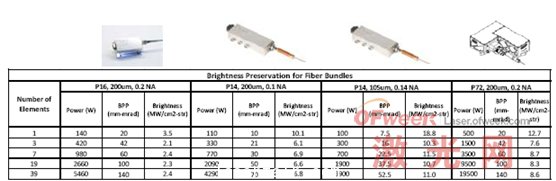 圖8 根據(jù)功率現(xiàn)有的產(chǎn)品空間,BBP和亮度對(duì)光纖包捆激光模塊。選擇光束資源的靈活性和光纖數(shù)量包捆提供了高靈活性光纖耦合激光模塊。廣泛的產(chǎn)品都可以用這個(gè)方法解決。