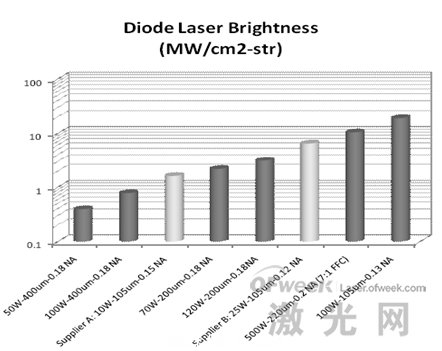 圖2.二極管激光器亮度(MW/cm2-str)為各種各樣的二極管激光器模塊。亮度超過(guò)18MW / cm2-str已經(jīng)達(dá)到了使用nLIGHT的PearlTM生產(chǎn)線的水平。
