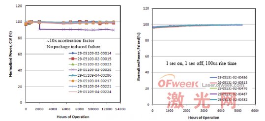 圖3.(左)激光器耦合模塊具有能夠超過(guò)100 W的光功率成0.15NA、105µm光纖的能力。(右)一個(gè)激光器模塊具有超過(guò)120 W耦合成一個(gè)200µm,0.2 NA 的光纖能力。為測(cè)量這些包裝的可靠性進(jìn)行了,九個(gè)模塊在10x加速度條件下被測(cè)量(加速高溫和功率運(yùn)作)。而激光激光器包裝測(cè)量的FIT率(1200FIT)和二極管激光器在終身測(cè)試套上所測(cè)試的FIT率(1150)相匹配,顯示出了缺乏包裝故障率(PIF)。這些設(shè)備的性能lifetest如下圖,如圖4。模塊失敗在輸出功率方面被描述為20%的退化(或相應(yīng)增加20% 偏置電流),在給定的加速因素下而激光激光器相當(dāng)于超過(guò)75000小時(shí)的操作下沒(méi)有模塊故障。類(lèi)似包裝運(yùn)行在硬脈沖條件下,以 20ms上升下降。