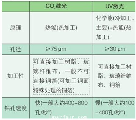 表1:CO2激光與UV激光鉆孔技術(shù)特性比較
