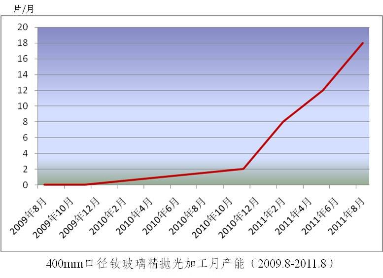 近年來,釹玻璃片精拋光過程中的面形控制工藝難度和表面疵病嚴(yán)重超標(biāo)的現(xiàn)象一直制約著上海光機(jī)所恒益公司的加工產(chǎn)能。近幾個(gè)月來,上海光機(jī)所恒益公司集中組織專業(yè)技術(shù)人員,對釹玻璃光學(xué)加工中的相關(guān)工藝逐一進(jìn)行分解和細(xì)化,圍繞確定性環(huán)形拋光技術(shù)和生產(chǎn)過程控制,以工藝改進(jìn)和效率提升為目標(biāo),從技術(shù)路線和管理路線兩個(gè)方面進(jìn)行攻關(guān)研究。目前,生產(chǎn)效能和加工工藝水平都取得重要進(jìn)展,集中表現(xiàn)為以下兩個(gè)方面:產(chǎn)能得到有效提升,7個(gè)月內(nèi),月產(chǎn)能從2片/月提升到現(xiàn)在的15片/月(見附圖);產(chǎn)品技術(shù)指標(biāo)提升,尤其是表面質(zhì)量得到有效控制和改進(jìn),供貨合格率得到大幅提高。