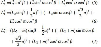 根據(jù)關節(jié)變量L1、L2和L3 ,以及B1、O、B3 點坐標,列距離方程可以求解到L2分支繞X 軸和繞Y軸的旋轉角度α和β .其求解方程如下: