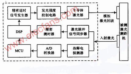 本方案的基本思想是將目標漫反射的遠方目標回波由半導體激光器模擬,當模擬該回波的光譜和空間特性后,即可驅(qū)動激光器的邏輯單元工作。而激光脈沖相應(yīng)距離上的飛行時間則由精密延時模塊實現(xiàn)。這樣將激光脈沖在空間的延遲特性轉(zhuǎn)換為時間特性,從而將遠方目標從一定距離拉近到被測儀器前端,代替了激光測距機性能檢測必須要有遠方的實際合作目標的傳統(tǒng)檢測方法。如圖3所示。