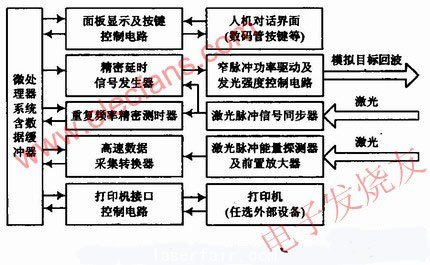主要包括微處理器系統(tǒng)、面板顯示及按鍵控制電路、精密延時信號發(fā)生器、窄脈沖功率驅(qū)動發(fā)光強度控制電路、精密測時器、激光脈沖同步器、激光脈沖能量探測器及前置放大器、高速數(shù)據(jù)采集轉(zhuǎn)換器及打印機控制電路等。