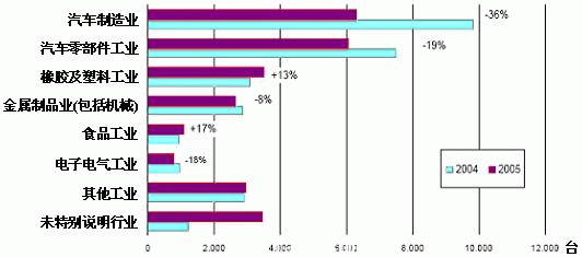 圖4: 2004-2005年歐洲地區(qū)各主要行業(yè)對工業(yè)機器人需求情況變化圖