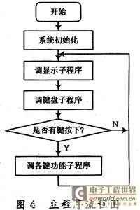 在主程序流程中,系統(tǒng)上電復(fù)位后,開始進行各模塊初始化,然后調(diào)顯示子程序,顯示數(shù)據(jù),再調(diào)鍵掃描子程序,若有鍵按下,則調(diào)相應(yīng)的鍵功能程序,若無鍵按下,則循環(huán)調(diào)用顯示程序。