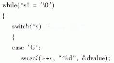 經(jīng)過預(yù)處理的G代碼指令逐行送入G代碼解碼程序,解釋程序再逐字檢查其是否為G代碼的指令字符,若是,則提取關(guān)鍵字的后續(xù)數(shù)值,作為該指令的操作數(shù),將其提取出來。其中用到了ANSI C的標(biāo)準(zhǔn)庫函數(shù)sscanf( )(位于stdio.h中),可以方便地提取字符串中指定的信息,支持類正則表達(dá)式的格式字符串,非常靈活。同時(shí)因?yàn)槭褂昧薃NSI C的標(biāo)準(zhǔn)庫函數(shù),程序移植簡單。