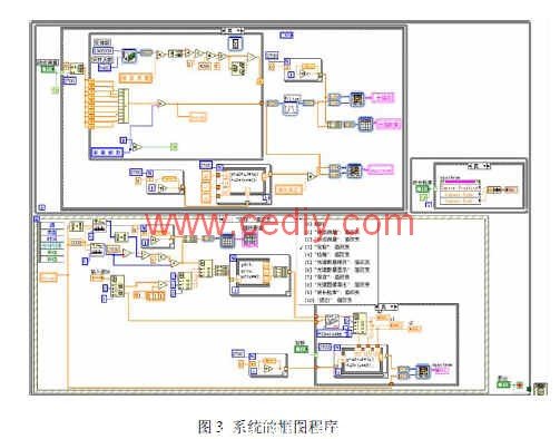 同樣,利用閾值峰值檢測模塊的調用來實現(xiàn)光譜譜峰的查找,在輸入閾值后就可顯示出波峰的位置、幅值信息。增加波長修正功能,即:當標準峰波長偏大,輸入負值;反之,輸入正值。通過Write LabVIEW Measurement 保存波峰檢測結果以及光譜數據,用ReadLabVIEWMeasurement 將已保存數據顯示成圖形 [6]。調用光譜圖屬性節(jié)點Image Export 導出光譜圖像,Cursor Position節(jié)點動態(tài)顯示某一波長對應光強值。系統(tǒng)的框圖程序如圖3。