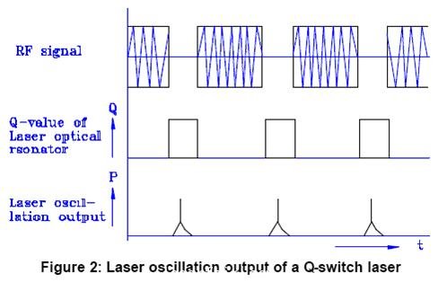 如果激光光學(xué)諧振腔的建成是相對于0維衍射光(非衍射光), 當(dāng)射頻信號被感知,衍射光便從激光光學(xué)諧振腔軸線產(chǎn)生. 結(jié)果,激光光學(xué)諧振腔內(nèi)發(fā)生損失,及激光振蕩受到打壓. 利用這一現(xiàn)象, 射頻信號只在特定某個時間長度內(nèi)被感知,(地位低Q值)來暫停激光振蕩. 在此期間,反轉(zhuǎn)的Nd:YAG激光棒通過連續(xù)泵浦積累了很多. 當(dāng)射頻信號減至零(地位高Q值)和激光光學(xué)諧振腔內(nèi)的損失消除了, 累積的能量以在極短的時間長度內(nèi)脈沖形式的激光振蕩被激活,. 他們是Q開關(guān)脈沖.