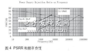 電源抑制比 (PSRR,Power supply ripple rejection ratio)是反應(yīng)LDO輸出對(duì)輸入紋波抑制能力的一個(gè)交流參數(shù),一般輸出和輸入的頻率是一樣的,PSRR的值越大說(shuō)明LDO的紋波能力越強(qiáng),也就是說(shuō)輸入對(duì)輸出的影響很小。盡管LDO的電源抑制比很強(qiáng),但都是在一定頻率內(nèi)的抑制很強(qiáng),一般的在50KHz到200kHz的電源抑制比還是很差的如圖4為SGM2007的PSRR和頻率曲線(xiàn),而這段頻率正是大多數(shù)開(kāi)關(guān)電源的工作頻率,如果LDO的負(fù)載和輸入輸出電容匹配不好,很容易引起LDO振蕩。而造成整個(gè)LDO供電系統(tǒng)的不穩(wěn)定。