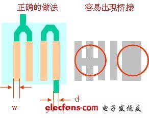 5.如果相鄰的焊盤需要相連,首先確認(rèn)在外面進(jìn)行連接,防止連成一團(tuán)造成橋接,同時(shí)注意此時(shí)的銅線的寬度。