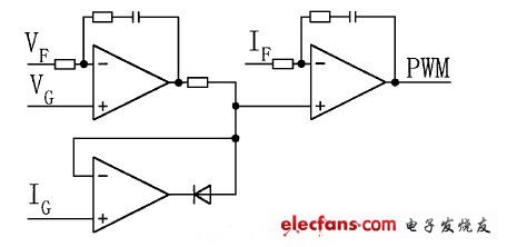 由于在本電源中使用的開關(guān)元件的過載承受能力有限,必須對輸出電流進行限制,因此,控制電路采用電壓電流雙環(huán)結(jié)構(gòu)(內(nèi)環(huán)為電流環(huán),外環(huán)為電壓環(huán)) ,調(diào)節(jié)器均為PID.圖8 為控制電路的原理框圖。加入電流內(nèi)環(huán)后,不僅可以對輸出電流加以限制,并且可以提高輸出的動態(tài)響應(yīng),有利于減小輸出電壓的紋波。