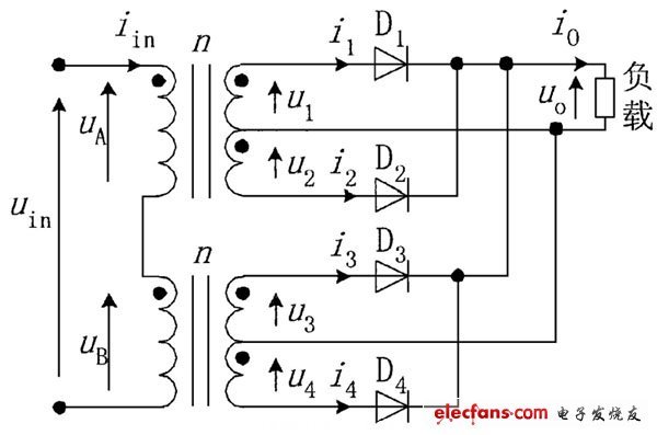 多個變壓器的這種連接方式,不僅可以使得輸出整流二極管實現(xiàn)自動均流,還可以使得變壓器的設(shè)計模塊化,簡化變壓器的制作工藝,降低了損耗。