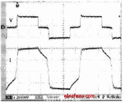 為了消除諧振及減小功率母排、濾波電容的溫升,我們最終采用了容性功率母排,圖4 為采用容性功率母排后滿功率時采集的變壓器初級的電壓、電流波形圖。從圖中可以看出,諧振基本消除,滿載運行一小時后,無感功率母排的溫升為11 ℃,電容C5的溫升為10 ℃。