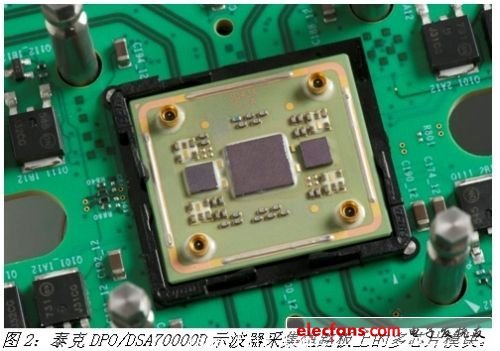 為保證最高階測量級信號的完整性,從DPO/DSA70000D探頭接口輸入的電信號使用高性能電纜直接傳送到多芯片模塊(圖3)。通過利用這種前所未有的方式,只有在采樣保持芯片捕獲測試信號后,測試信號才接觸示波器采集電路的PCB,從而實現(xiàn)了100GS/s的采樣率和行業(yè)領(lǐng)先的噪聲性能。