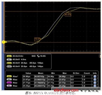 在使用DPO/DSA73304D的情況下,使用這種方法確定出9ps的上升時間。但是,信號速度可以被測量的意思是什么呢?根據(jù)正確的經(jīng)驗法則,信號上升時間與示波器上升時間的比值為2x或>18ps。事實證明,對于當今最快的FPGA設(shè)計中使用的28Gb/s的串行解串器(SerDes)而言,這是指定的上升時間。