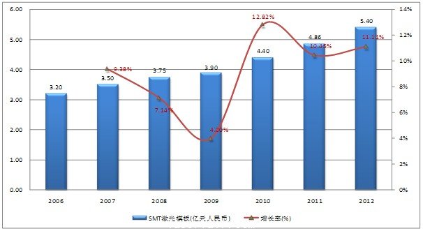 首先,我們先討論激光漏印模板中的SMT激光模板,下表是2006~2012年中國(guó)SMT激光模板的市場(chǎng)容量估計(jì)圖: