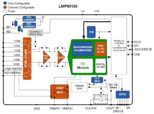 LMP90100提供了一個(gè)高度集成的8通道輸入多路復(fù)用器的組合,是一個(gè)帶有可調(diào)增益系數(shù)和24位Σ-ΔADC的高精度放大器。器件包括電流源、電壓基準(zhǔn)和其他功能。圖1顯示了該集成電路的內(nèi)部結(jié)構(gòu):用戶可以根據(jù)傳感器和測(cè)量任務(wù)匹配圖中的所有彩色塊。