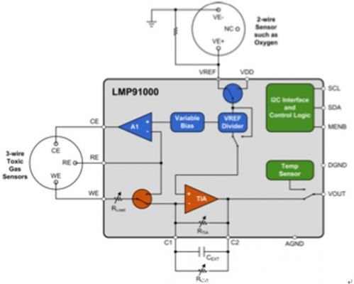 LMP91000是一個(gè)電流消耗非常低的純模擬解決方案,這使其特別適合便攜式應(yīng)用。LMP91000的平均功耗小于10μA,但是,當(dāng)與新的傳感器連接時(shí),它能夠驅(qū)動(dòng)高達(dá)10mA的電流。LMP91000可以將傳感器與作為原電池(galvanic cell)工作的兩個(gè)電極連接在一起,或者根據(jù)安培原則運(yùn)作將傳感器與三個(gè)電極連接在一起。當(dāng)連接一個(gè)三電極傳感器時(shí),LMP91000可作為一個(gè)恒電勢(shì)器(potentiostat)使用,當(dāng)連接原電池(對(duì)地或?qū)⒖茧妷海r(shí),它也可作為一個(gè)緩沖器。適合這些傳感器的典型氣體示例列于表1。