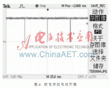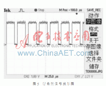 對(duì)EP2C8T144C8下載配置完成后,用示波器探頭測(cè)量MT9P401的幀有效信號(hào)(Frame_Valid)和行有效信號(hào)(Line_Valid)輸出引腳,查看輸出波形,如圖4和圖5所示。從圖中可以看到有連續(xù)的幀有效信號(hào)和行有效信號(hào)輸出,而且?guī)行盘?hào)的周期約為70 ms,行有效信號(hào)的周期約為35 μs,符合MT9P401的驅(qū)動(dòng)時(shí)序要求,說(shuō)明FPGA完成了對(duì)MT9P401的驅(qū)動(dòng)設(shè)置。