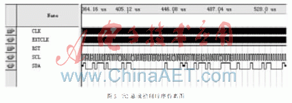 如圖3所示,I2C總線控制仿真時(shí)序一共包含兩個(gè)輸入端和三個(gè)輸出端的波形狀況。其中EP2C8T144C8的控制時(shí)鐘CLK為50 MHz,MT9P401的輸入時(shí)鐘EXTCLK為100 MHz,復(fù)位信號(hào)RST為高電平,I2C的串行時(shí)鐘SCL為500 kHz。同時(shí)通過(guò)I2C的串行數(shù)據(jù)線SDA依次對(duì)MT9P401內(nèi)部的(11)H和(30)H兩個(gè)寄存器進(jìn)行配置,配置過(guò)程遵循I2C總線傳輸協(xié)議。