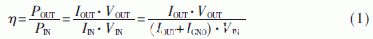 由于CMOS圖像傳感器的供電電源需要有較高的紋波抑制和噪聲,同時(shí)輸出壓降要低,結(jié)合設(shè)計(jì)低成本、低功耗等因素,在電源部分選擇TI公司的單端輸出LDO[2](TPS77001、TPS79003)作為供電模塊。LDO的工作原理是通過(guò)負(fù)反饋調(diào)整輸出電流使輸出電壓保持不變。LDO是一個(gè)降壓型的DC/DC轉(zhuǎn)換器,因此Vin>Vout,它的工作效率可以用式(1)表示:
