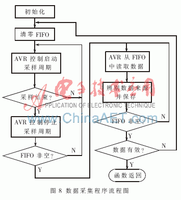 綜合前文所有的分析說(shuō)明,編寫了AVR+CPLD+FIFO信號(hào)的C語(yǔ)言程序,圖8是程序流程圖。該程序中包含了FIFO清零、采集周期啟??刂?、FIFO狀態(tài)判斷、數(shù)據(jù)來(lái)源分析、數(shù)據(jù)有效性判斷等多個(gè)子項(xiàng),最終采集得到一個(gè)掃描周期的準(zhǔn)確、有效的數(shù)據(jù)以供后續(xù)電路進(jìn)行處理。通過(guò)試驗(yàn)證明,程序達(dá)到了預(yù)期目的。
