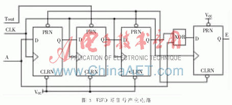 光電二極管接收的信號(hào)經(jīng)前置放大及整形后頻率比較高,由于系統(tǒng)一共有4路信號(hào),AVR來(lái)不及直接去讀取每個(gè)跳變沿的計(jì)數(shù)值,因而通過(guò)FIFO暫時(shí)緩存,待采樣周期過(guò)后,AVR再?gòu)腇IFO中讀出計(jì)數(shù)值。要把計(jì)數(shù)值寫入FIFO中,必須有正確的寫信號(hào),CY7C433對(duì)讀寫信號(hào)的時(shí)序有要求,寫信號(hào)脈寬tPW≥15 ns,數(shù)據(jù)建立時(shí)間tSD≥8 ns,數(shù)據(jù)保持時(shí)間tHD無(wú)最小值要求。據(jù)此本文設(shè)計(jì)了圖5所示的FIFO數(shù)據(jù)寫信號(hào)產(chǎn)生電路,這一電路實(shí)質(zhì)上是一個(gè)跳沿提取電路。輸入的數(shù)字脈沖信號(hào)首先經(jīng)過(guò)三個(gè)觸發(fā)器延時(shí)三個(gè)時(shí)鐘周期,之后對(duì)原信號(hào)進(jìn)行異或,這樣在信號(hào)的每個(gè)跳沿到來(lái)時(shí)便能產(chǎn)生一個(gè)3個(gè)時(shí)鐘脈沖寬度的低電平脈沖。當(dāng)CPLD時(shí)鐘選為40 MHz時(shí),此低電平脈沖的脈寬為75 ns,足以滿足FIFO對(duì)寫信號(hào)的要求。