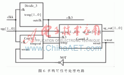 多路寫信號(hào)處理電路在QuartusII9.0環(huán)境下的仿真結(jié)果如圖7所示,圖中sgg為輸入的單路寫信號(hào)脈沖,wrout為輸出的多路寫信號(hào)[6-7]。